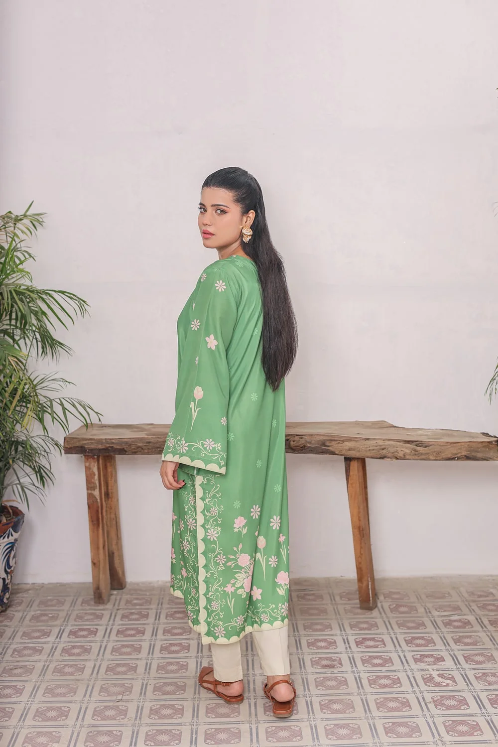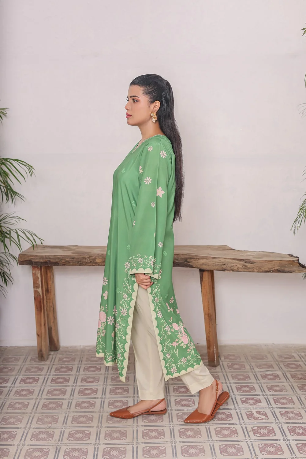 The Floral Cascade long shirt features a refreshing green hue, adorned with delicate pink floral patterns that bloom across the fabric, bringing an exclusive and artistic touch to your wardrobe.
