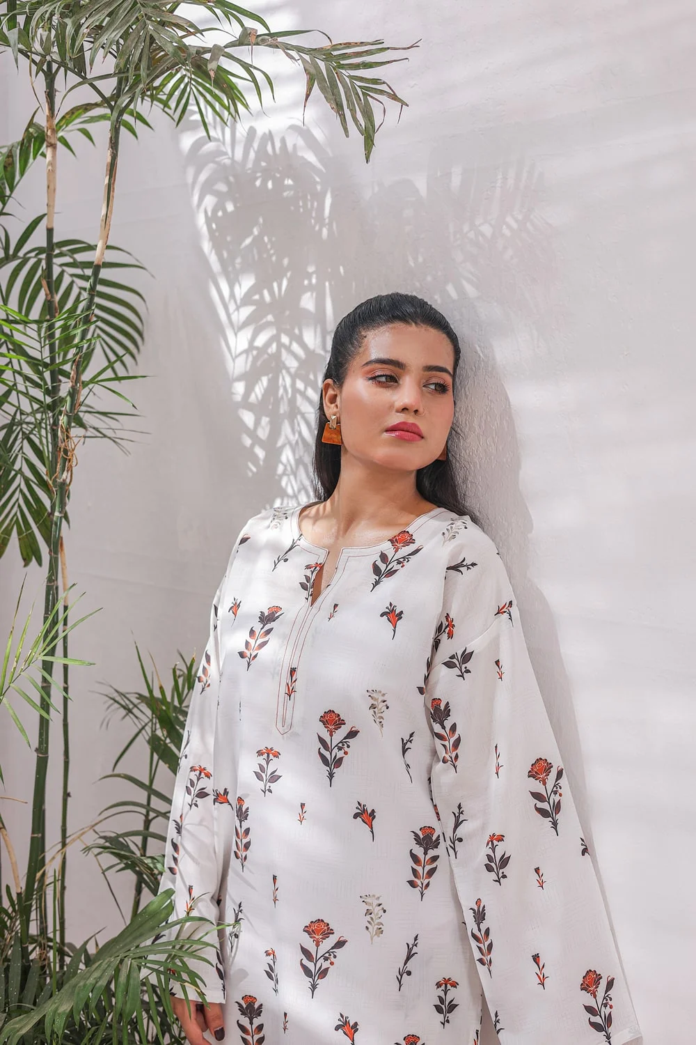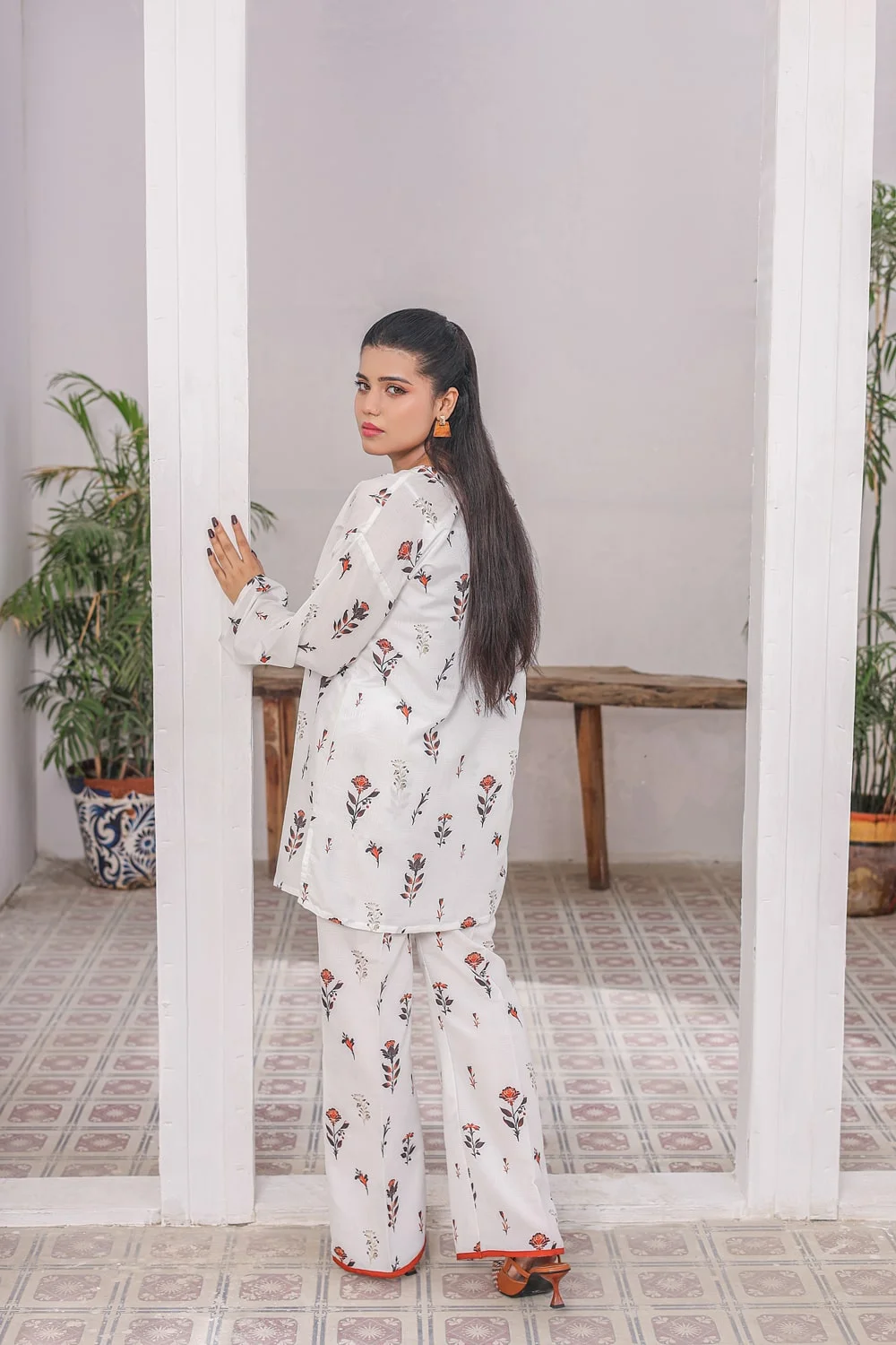 The sun-kissed canvas set features a chic short shirt and perfectly matched trousers, adorned with a mesmerizing print inspired by the serene beauty of a garden touched by the warm, subtle hues of embers.