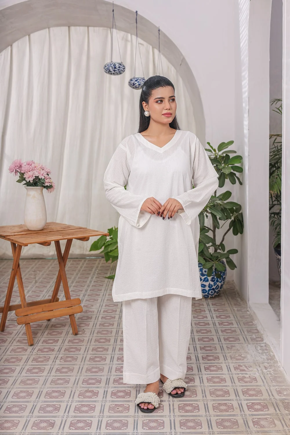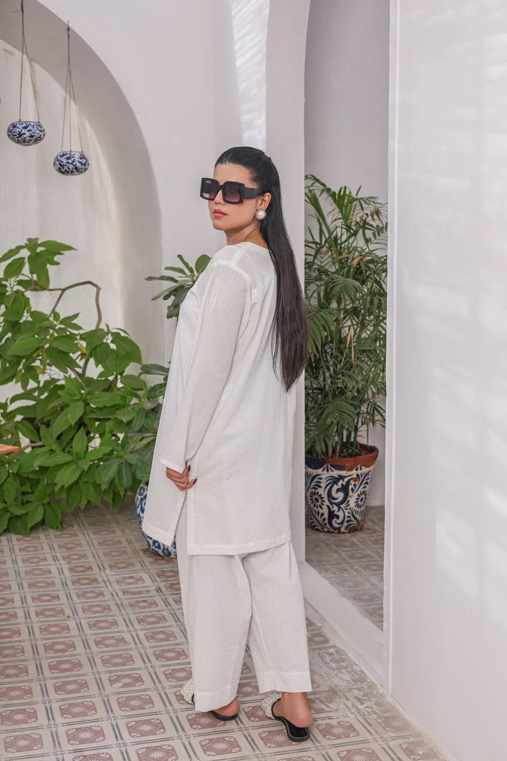 The Pristine Elegance set features a classic white hue, exuding a sense of purity and understated luxury. This co-ord set, comprising a stylish mid-length shirt and perfectly matched trousers, is designed for those who appreciate clean lines and refined simplicity.